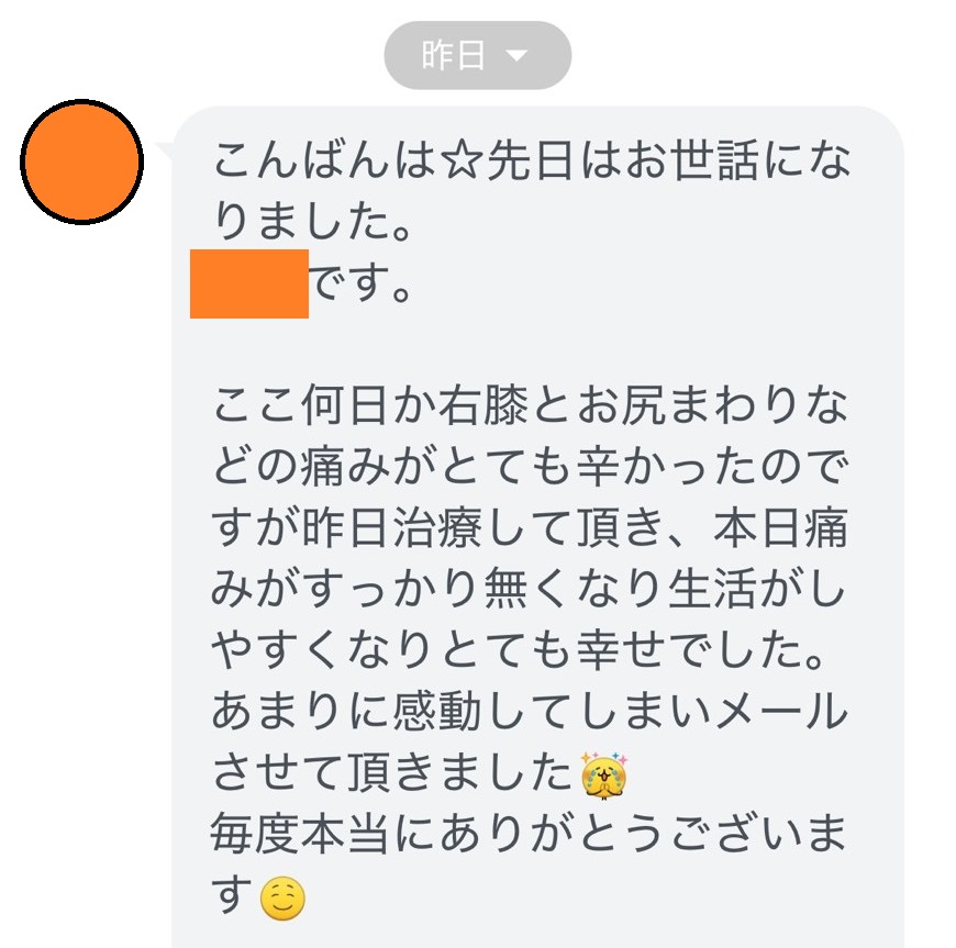 症例のご紹介 【患者さまのお声】感動してLINEしちゃいました! 先日、月に1回当院に通われている患者さんから、こんなLINEを頂きました。 の妹さん(岡山県在住)の方が 。 *** ここ何日か右膝とお尻まわりなどの痛みがとても辛かったのですが昨日治療して頂き、本日痛みがすっかり無くなり生活がしやすくなりとても幸せでした。あまりに感動してしまいメールさせて頂きました毎度本当にありがとうございます *** こういった喜びのお声を頂くと、より一層「頑張るぞー!」という気合がはいりますっ 2025年10月20日症例のご紹介お客様の声お知らせもどる