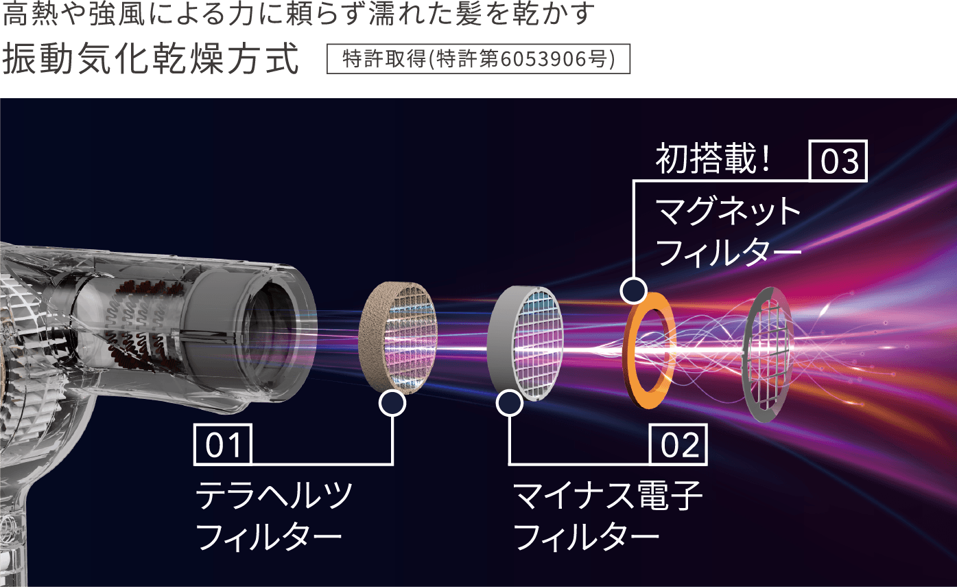 しかも、熱だけに頼らず、空気を振動させて髪を乾かすので、